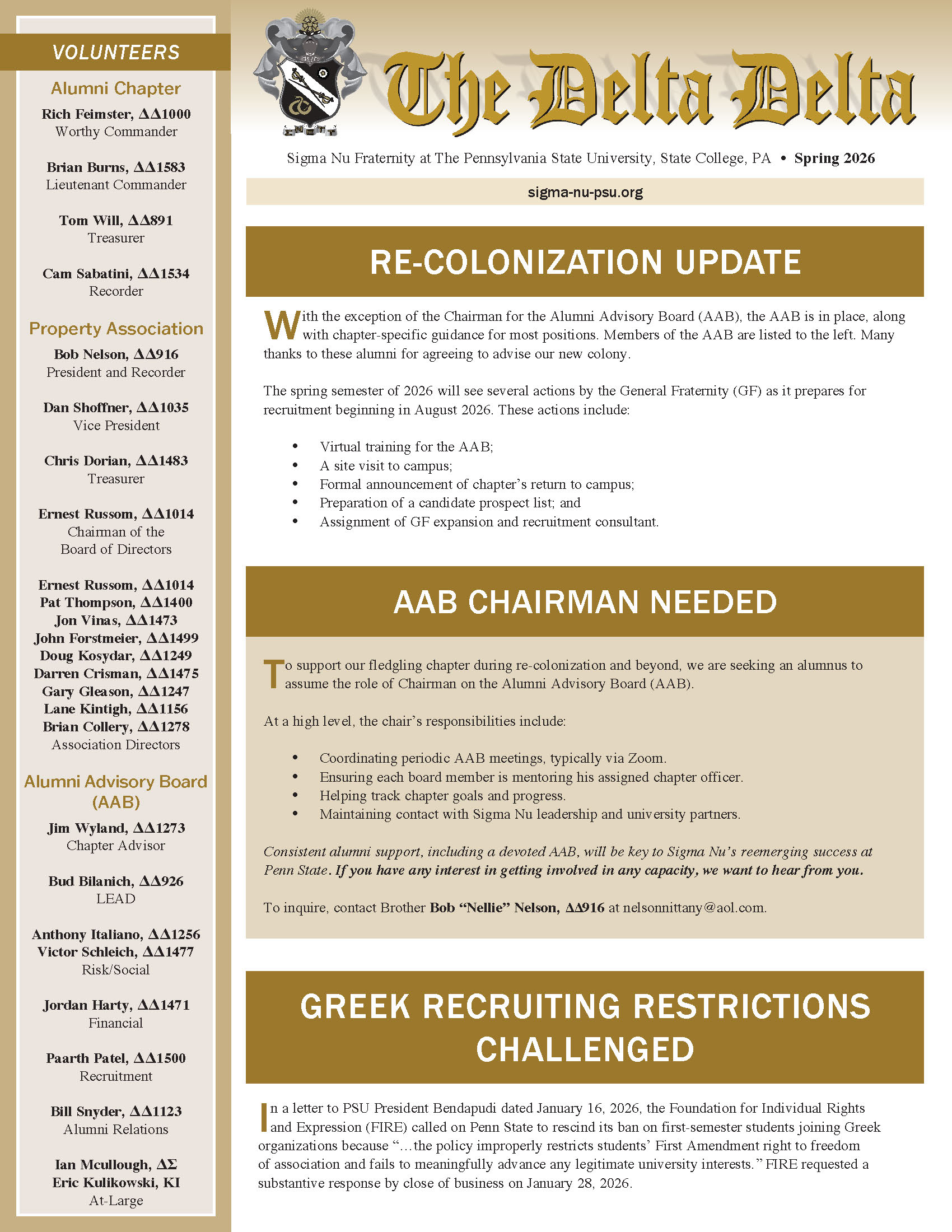 A few times a year, we mail the Sigma Nu Alumni Newsletter, The Delta Delta, to our loyal alumni to keep us all connected and informed.* Enjoy archived editions of past newsletters here.